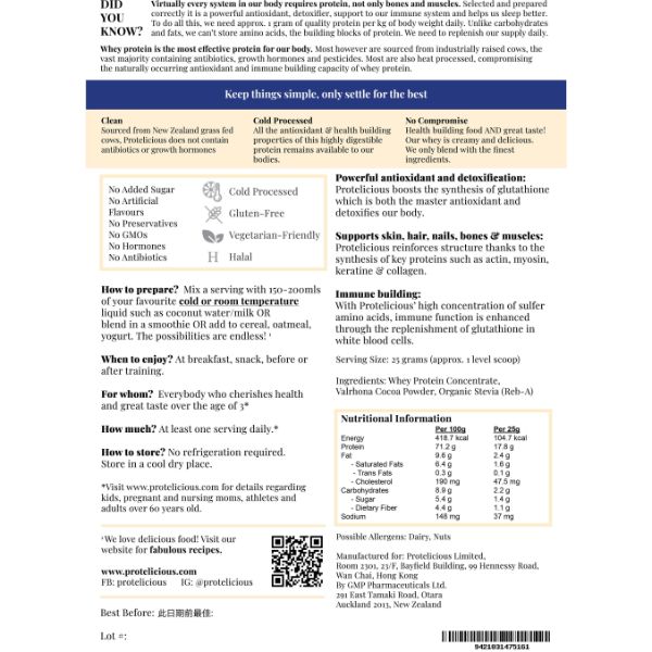 Provides Antioxidant Benefits - Experience the rejuvenating power of antioxidants. Protelicious whey protein is infused with potent antioxidants that combat free radicals, helping you maintain a youthful glow and vibrant well-being.