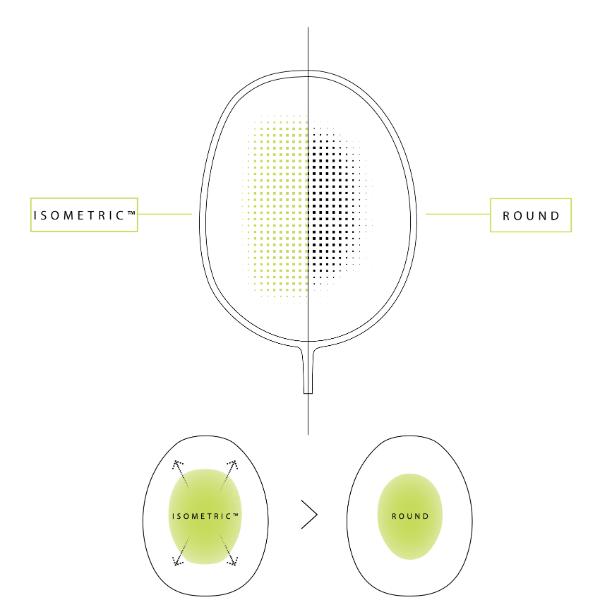 Developed over 30 years ago, the ISOMETRICTM design increases the sweet spot by 7%*. Compared to a conventional round frame, a square-shaped ISOMETRICTM racquet generates a larger sweet spot by optimizing the intersection of the main and cross strings.