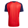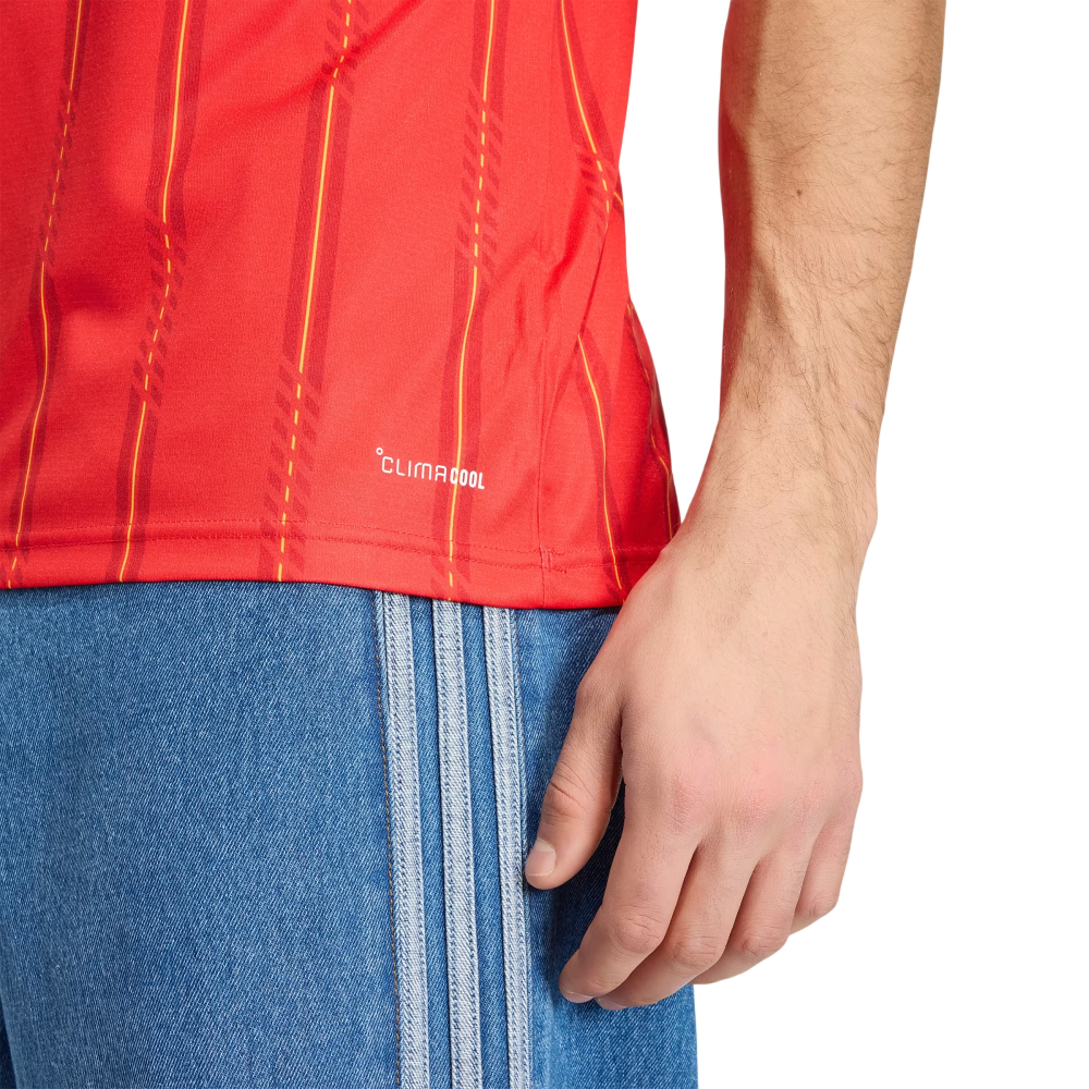 The Spain 26 Home Jersey is a tribute to the passion and heritage of Spanish soccer. Inspired by the vibrant colors of the Spanish flag, it's designed to make a statement both on and off the field. COOL. Dry. Ready. Climacool wicks and disperses sweat for a cool, dry, and distraction-free performance. The quick-drying interlock knit fabric helps you feel comfortable during intense games, so you can focus on your performance. Its slim fit creates a sleek silhouette that moves with you, while the rib collar adds a classic look. The adidas branding elements and team crest round off the jersey, adding to its elegant style. Whether you're cheering from the stands or taking part in a game, express your pride for the Spanish national team with this iconic jersey from adidas that embodies the spirit of soccer.