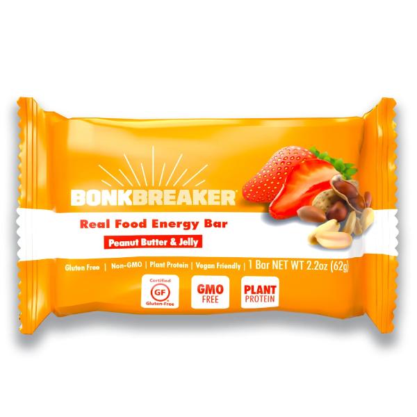 The ORIGINAL Bonk Breaker, our PB & J Energy Bar packs a punch of flavor you can look forward to. Real peanuts, gluten-free oats, and strawberry jam deliver simple carbs for easy digestion and fast energy, with healthy fats to keep from crashing. Every Bonk Breaker Energy Bar is 100% plant-based, soy-free, dairy-free, and gluten-free.