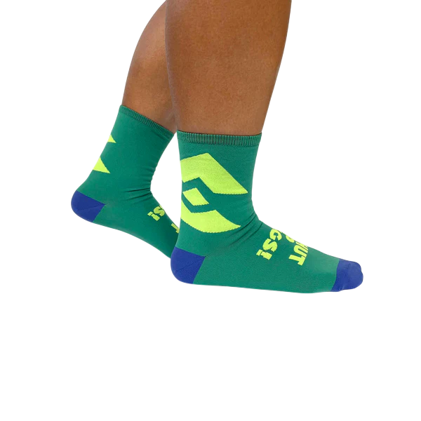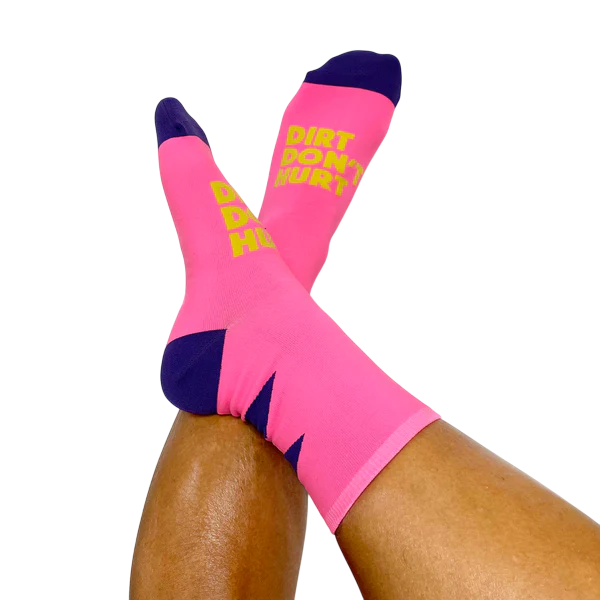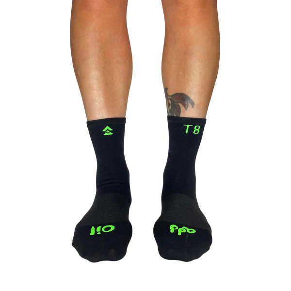 Defy Gravity Socks: This is our exciting collaboration with elite T8 ambassador, Eszter Csillag, who shows that the socks represent the idea that running is about our mindset and how we perceive our progress: "Speed is relative, like gravity, as it's different on uphills, downhills or flats. Speed is different on the trail or road and, finally, speed is different for different runners. My speed is not the speed of another person's speed, so it's like saying just run your own speed (race)." In terms of the visual design, Eszter explains, "The two words 'Defying Gravity' alongside the sparkling wings show is what is possible and is what other runners can see. It shows the runner as a Greek god who can fly, scaring others or showing others how strong you are.”