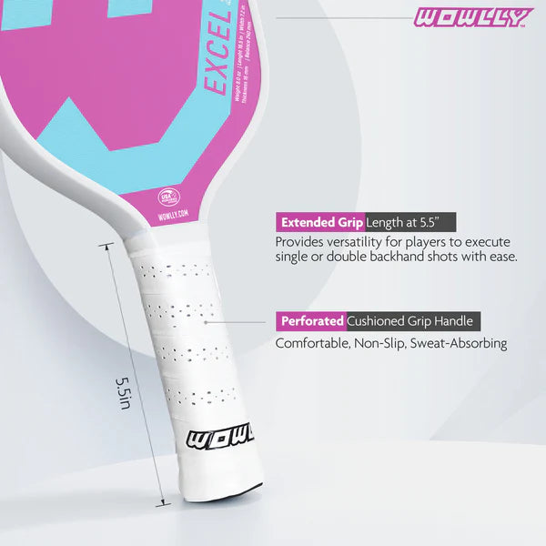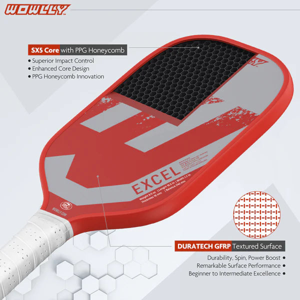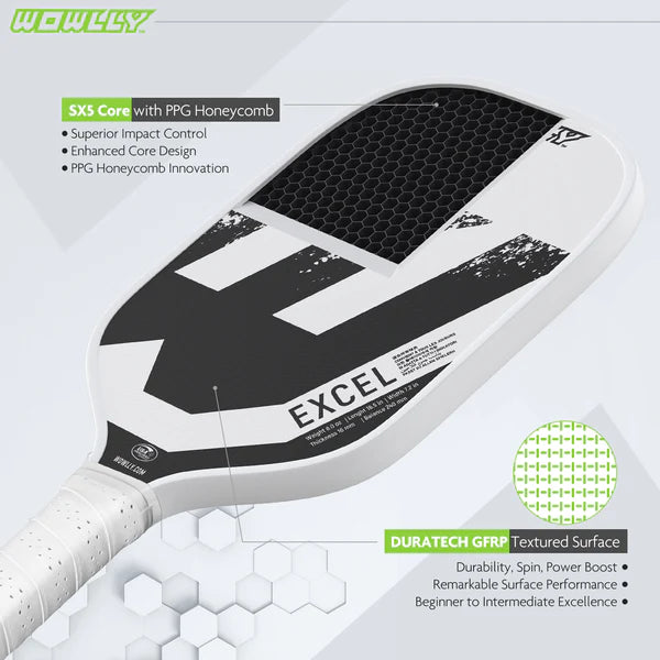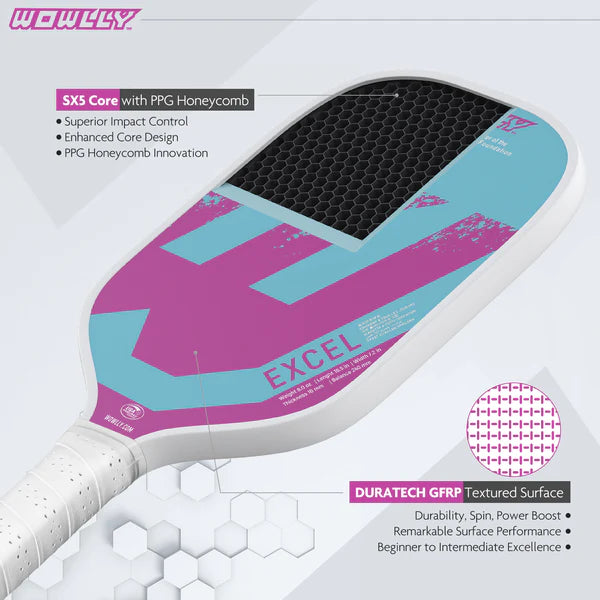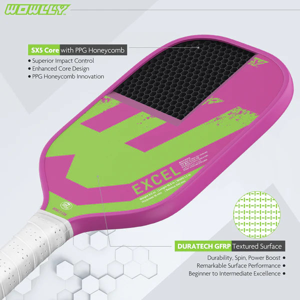 WOWLLY EXCEL 系列匹克球拍採用 DURATECH GFRP 紋理表面,提供卓越的旋轉和力量。SX5 核心,配備厚 2.3 毫米的 PPG 蜂巢結構,為各級別選手增強控制力和容錯性。